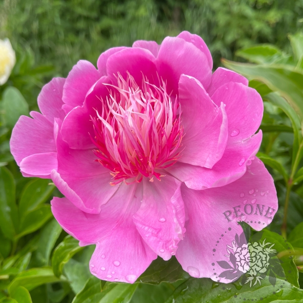 Мягкий вишнево-розовый пион с японской формой цветка. Лепестки, почти однородные по цвету, окружают яркие желто-розовые стаминодии, чем-то напоминающие языки пламени горящего костра. При отцветании бледнеют не только лепестки, но и центр цветка становится почти полностью белым. Слабый приятный аромат. Пион исключительной чистоты и утонченности.