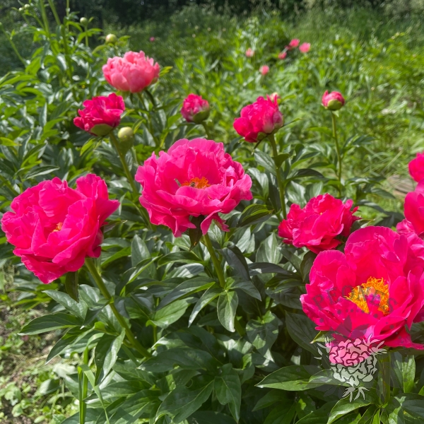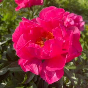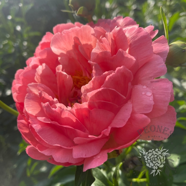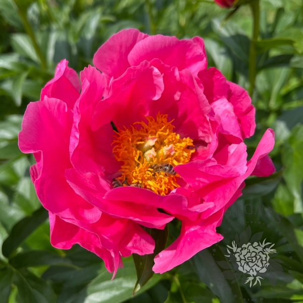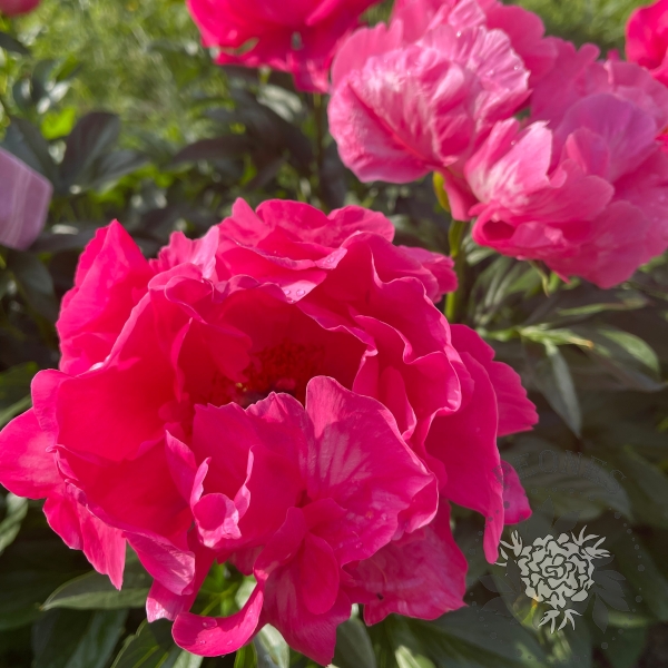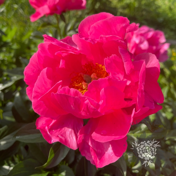 Этот пион отличается поразительными переливающимися насыщенно-розовыми цветками, с характерным алым оттенком, который очень сложно передать на фотографиях. Их гофрированные лепестки являются как бы визитной карточкой этого сорта. Цветки расположены вертикально на крепких стеблях с темно-зелеными листьями и все растение очень аккуратно смотрится в саду. Цветки полумахровые, содержат 5 рядов лепестков. Сеянец сорта Bravura от Сандерса, этот гибрид второго поколения в некоторой степени фертилен к определенным видам пыльцы и в при скрещивании с Moonrise дал замечательные сорта Royal Rose и Salmon Dream. Очень яркий акцент в саду, жизнерадостный.