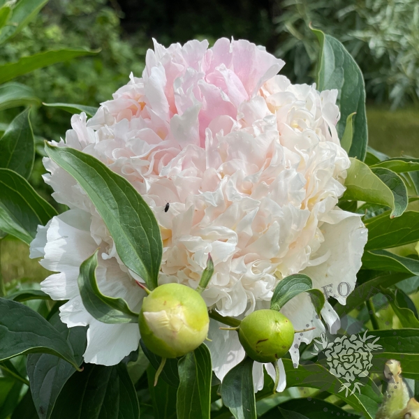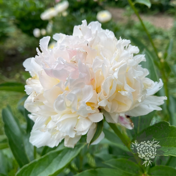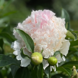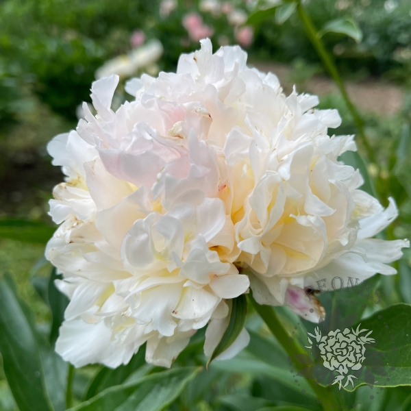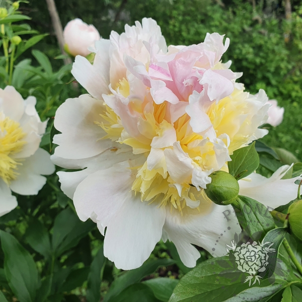 Цветок махровый, бомбовидный, трехцветный. Нижние лепестки широкие, белые, отогнуты назад. Средние нежно кремовые, подбитые светло-желтыми стаминодиями. Верхние лепестки (их больше всего) - нежно-розовые, изогнуты и собраны в виде густого и очень крупного шара. Диаметр цветка 16-18 см. Куст компактный, прямостоячий, несколько раскидистый. Стебли толстые, длинные, прочные. На стебле до четырех бутонов. Листья крупные, зеленые с блеском. Облиственность очень хорошая. Аромат нежный, розовый. Назначение - универсальное, но в основном больше срезочный сорт. Долго нарастает, но ожидание того стоит!
